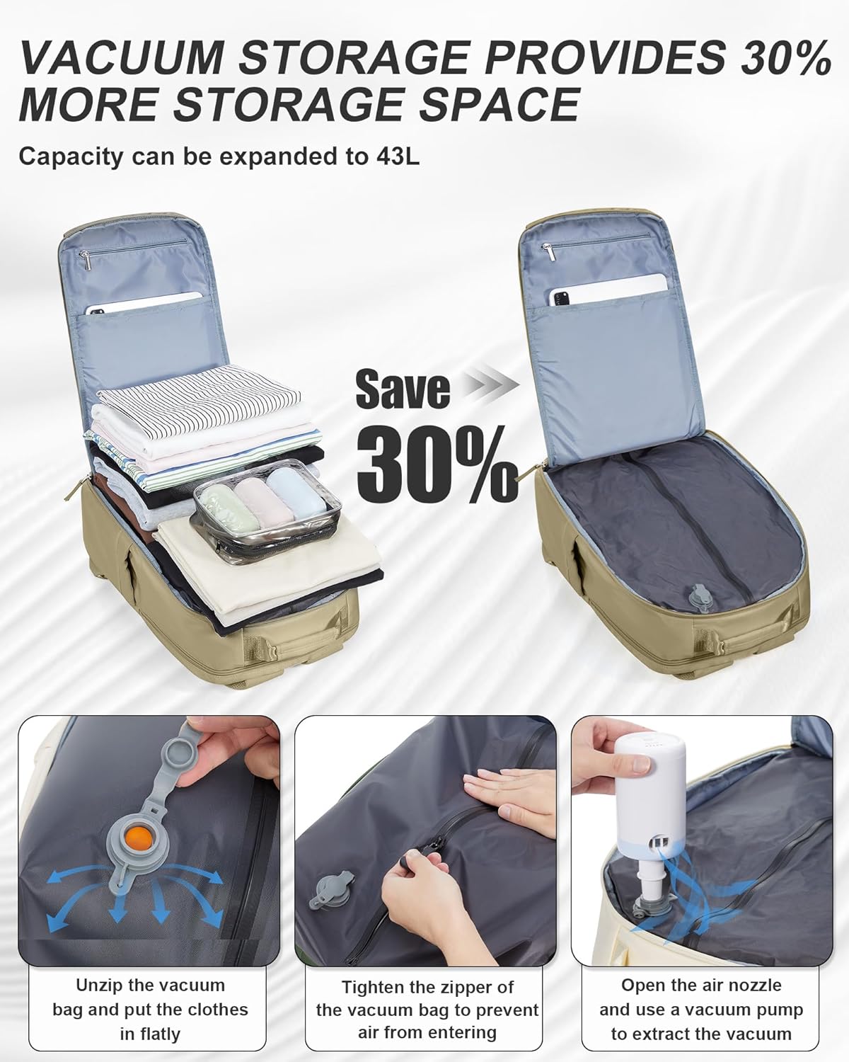✅ [Vacuum Sealing Storage] The travel backpack features a built-in vacuum system that compresses clothing and saves up to 30% of space. The vacuum bags are made of premium materials with waterproof zippers to keep clothes dry and protected. Equipped with an electric vacuum pump, it’s lightweight, portable, and easy to use—making every journey more effortless.