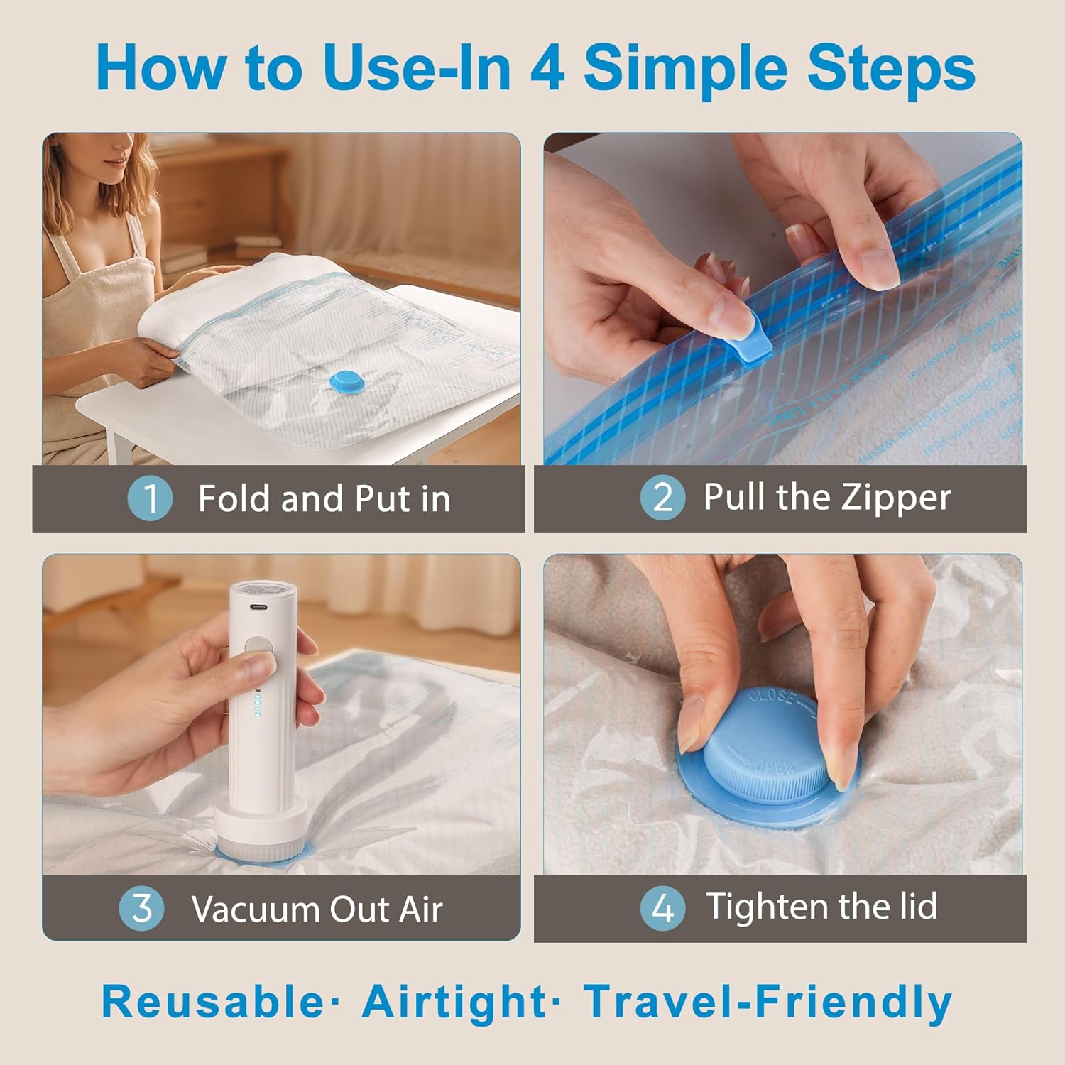 [Designed For Travel] Our vacuum seal bags for clothing of different sizes are designed for luggage, optimizing storage space for maximum storage during your trip, and equipped with a mini Cordless electric pump to easily organize your clothes and other items anytime, anywhere.