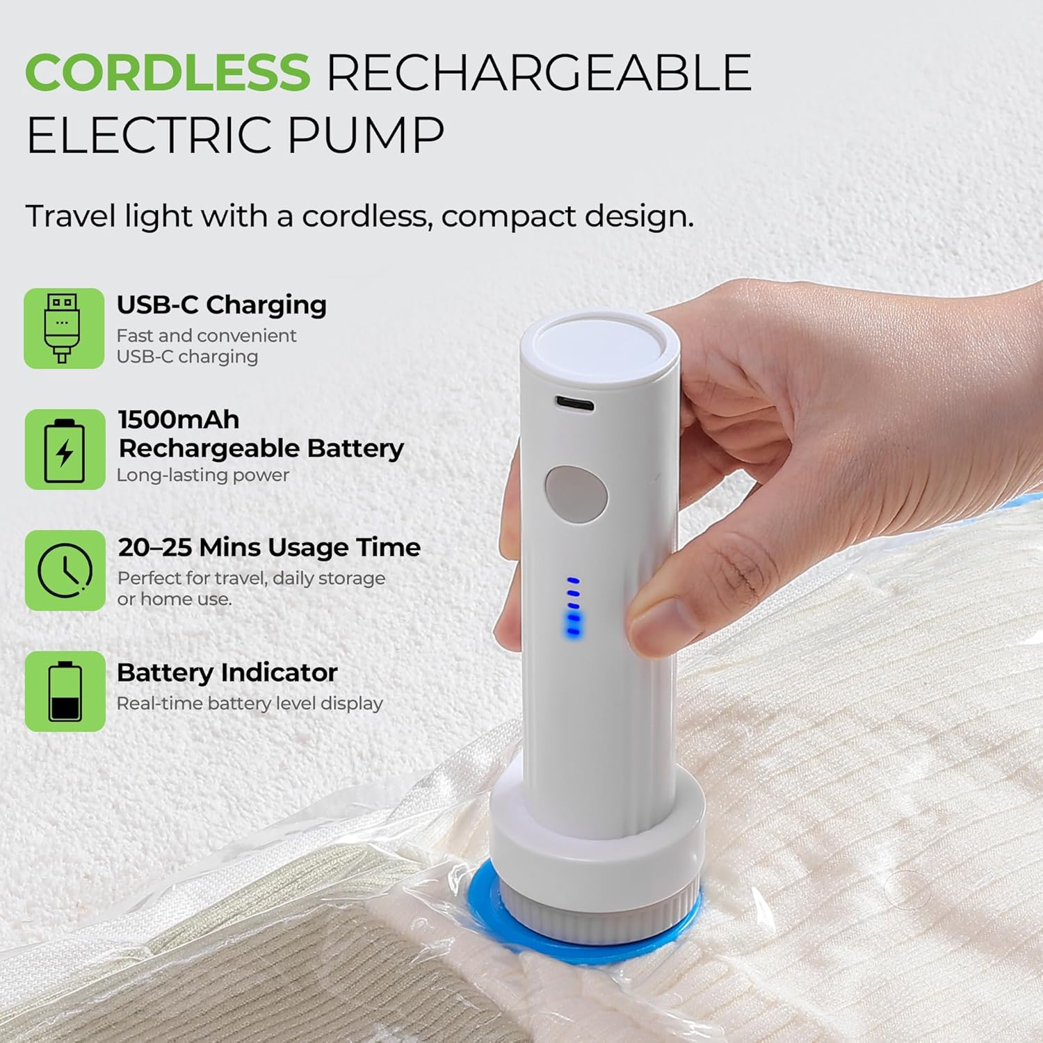 Cordless & Rechargeable for Travel – Includes a portable wireless electric pump with a built-in 1500mAh battery—compress up to 90 bags on a single charge. Convenient USB-C charging works with laptops, power banks, or any USB outlet. Lightweight, travel-ready, and compatible with worldwide voltage