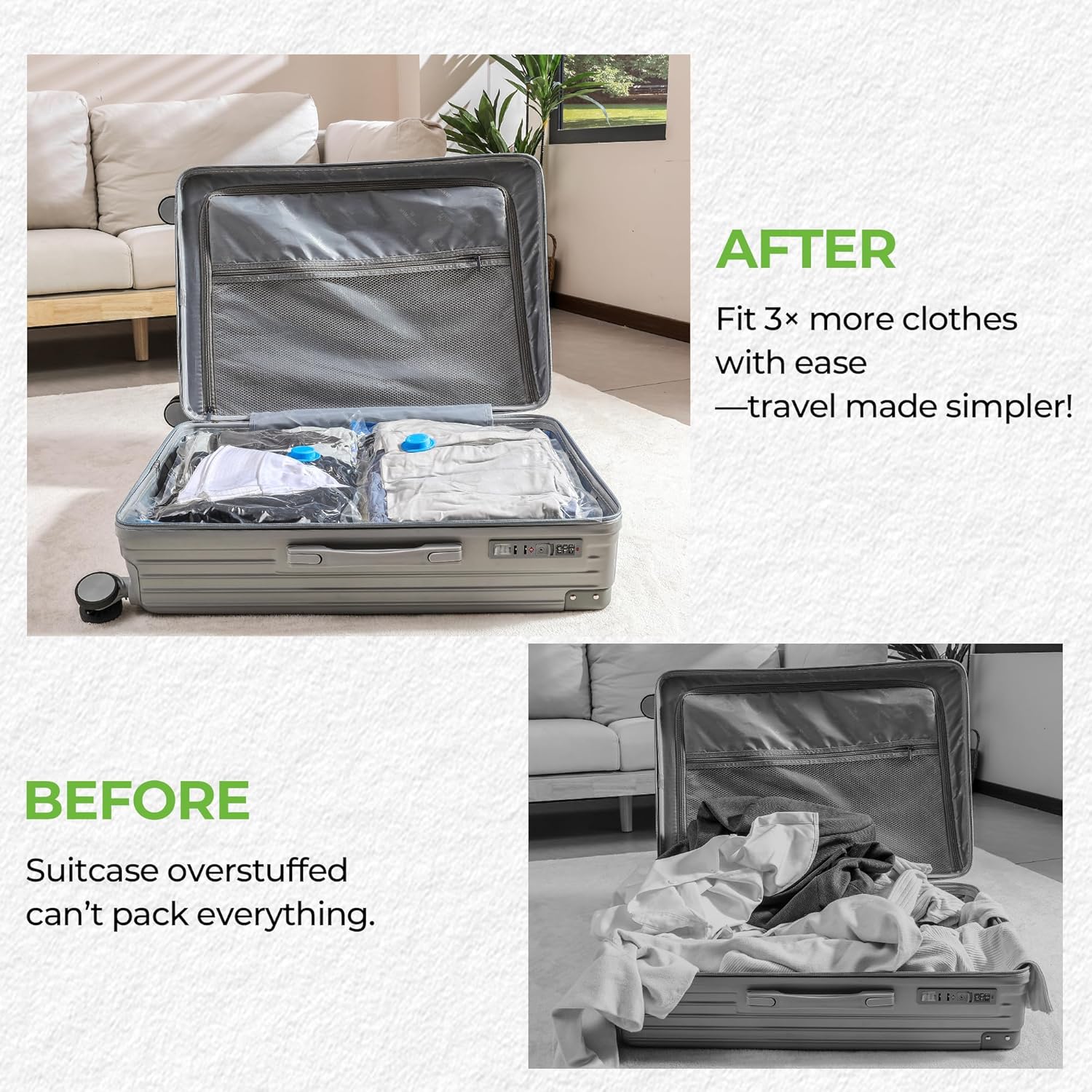 Pack Smart with Custom-Sized Travel Bags – MUIMUICHU 15-Pack Travel Vacuum Bag Set includes 15 travel vacuum bags: 5 Xsmall: 13.8”X 19.7″; 5 Small: 15.8”X 23.6″; 5 Medium: 19.7”X27.5”.. Maximize suitcase space with ease—perfect for everything from underwear and T-shirts to bulky coats and jackets. Smartly sized to fit perfectly in backpacks, carry-ons, and checked luggage