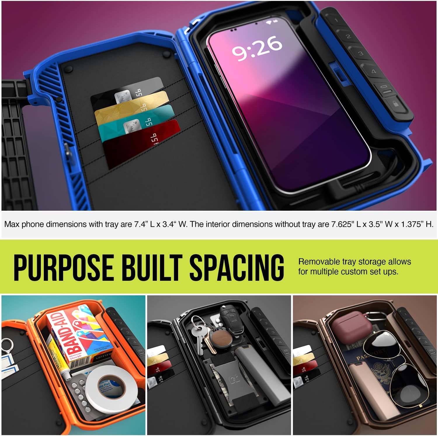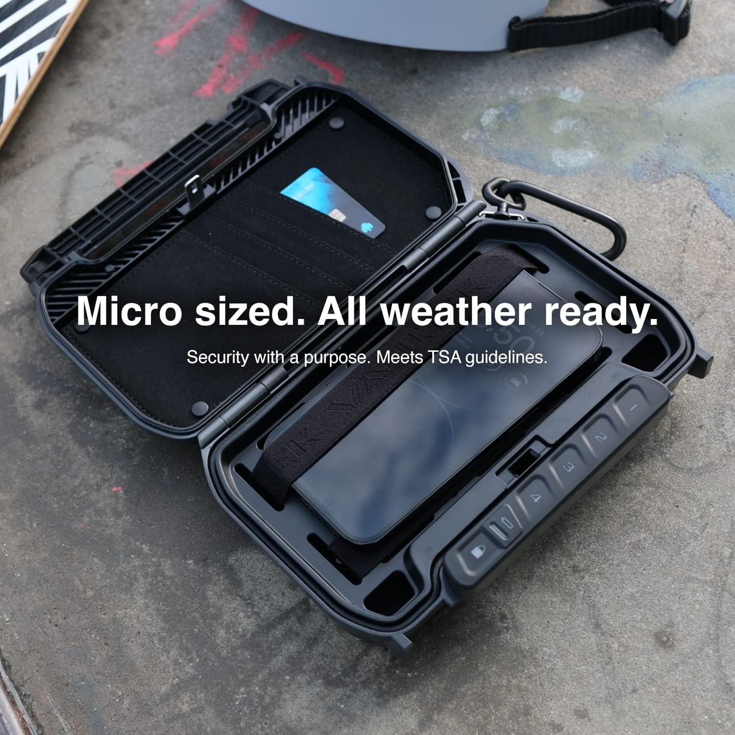 Rugged portable protection with a built-in lock system. LifePod X features a built-in lock allowing you to quickly secure the LifePod for added security when needed. Portable size can store an average smartphone, cash, passports, medicine, and other smaller belongings and provides convenient protection when traveling or on the go. Store in backpacks, vehicles, luggage, or attach anywhere with the included carabiner.