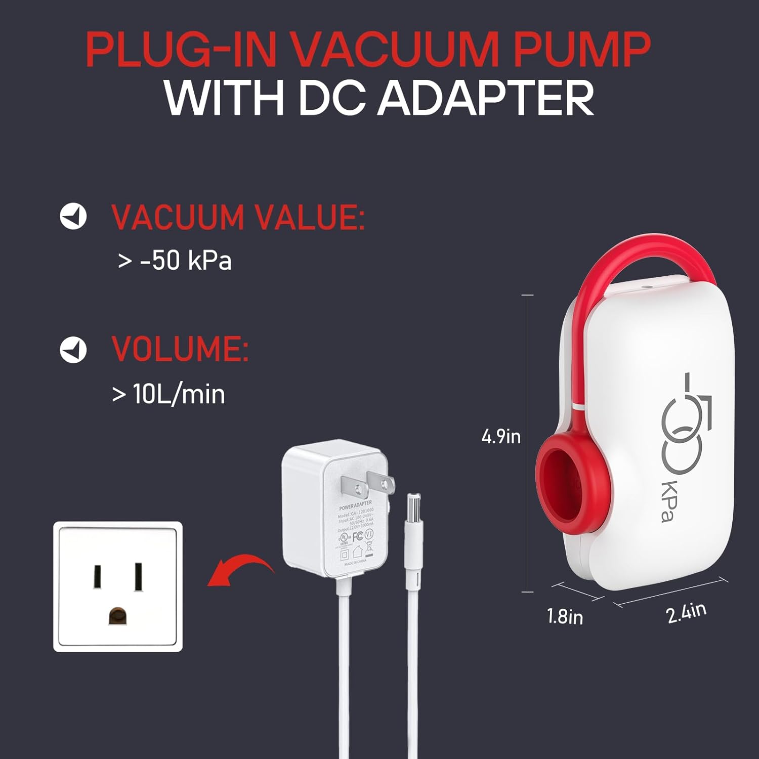 Plug-in Vacuum Pump: Includes DC adapter for US outlets (100-240V). No batteries needed. Ready to use immediately for convenient vacuum sealing