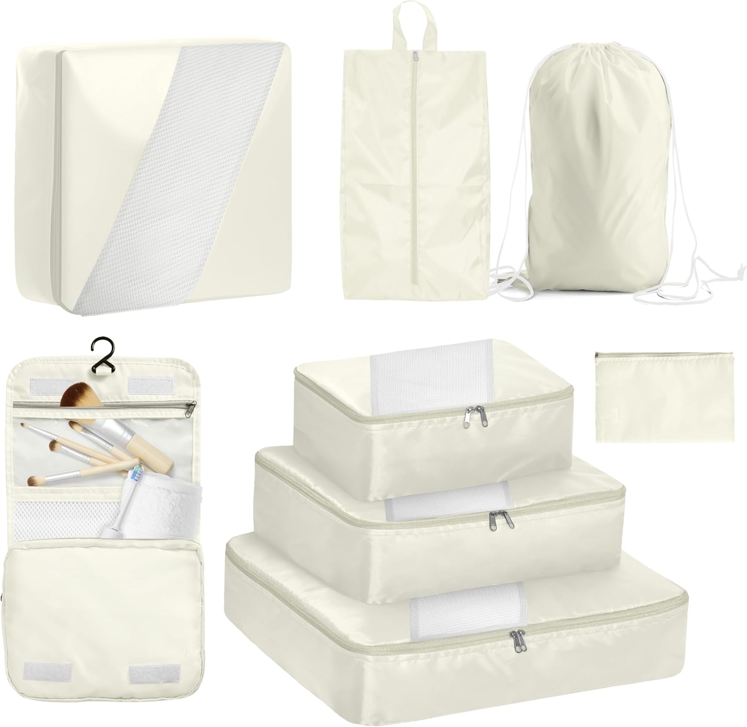 WVM Packing Cubes for Travel, 8-Piece Luggage Organizer Set with Shoe Bag, Toiletry Bag & Laundry Bag, Beige