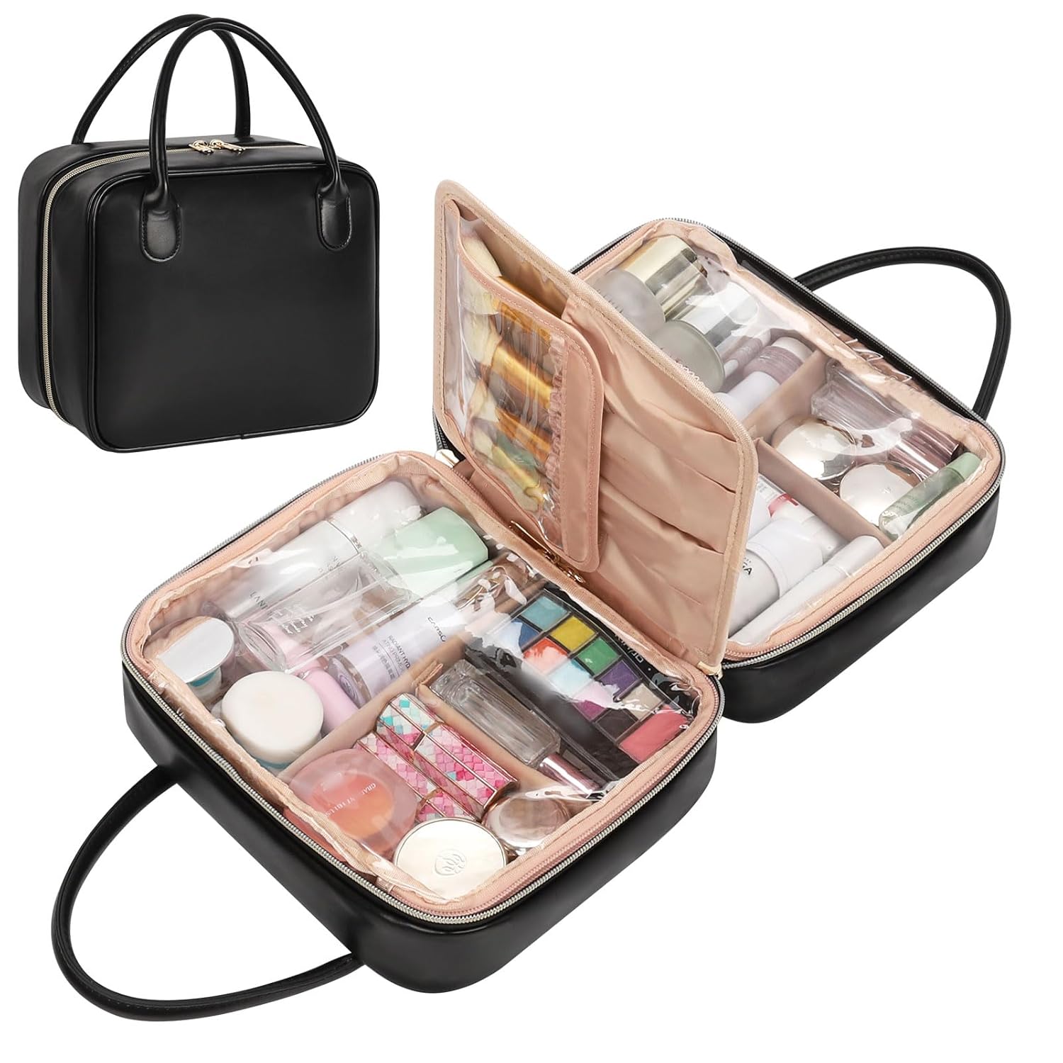 DOUBLE SIDE FULL OPEN DESIGN: 2 side compartments can be laid flat, no need to open the main compartment to search. Use the elastic band, mesh pockets and pouches to sort your tooth brushes, razors, electric trimmer or other small items