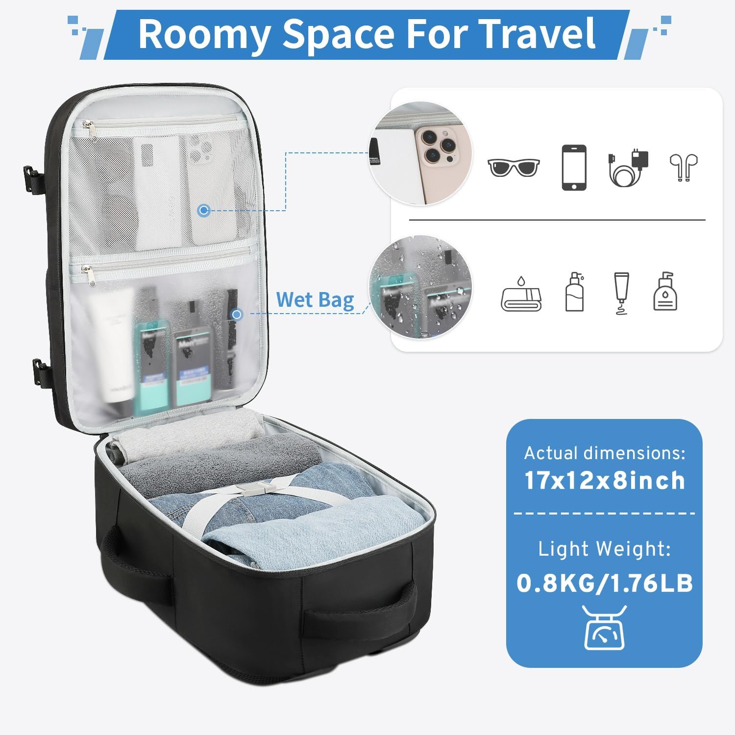 Flight Approved Carry on Backpack: The TSA backpack for travel measures 17*12*8 inches and weighs 0.8 kg(1.76 lbs). This travel backpack for women men traveling features a 180 degree zipper closure to help you pass through security check quickly, compliant with airline carry-on requirements. Can be a personal item travel bag and weekender bags for wowen fits overhead bin or under the seat and save on paying any extra baggage fees